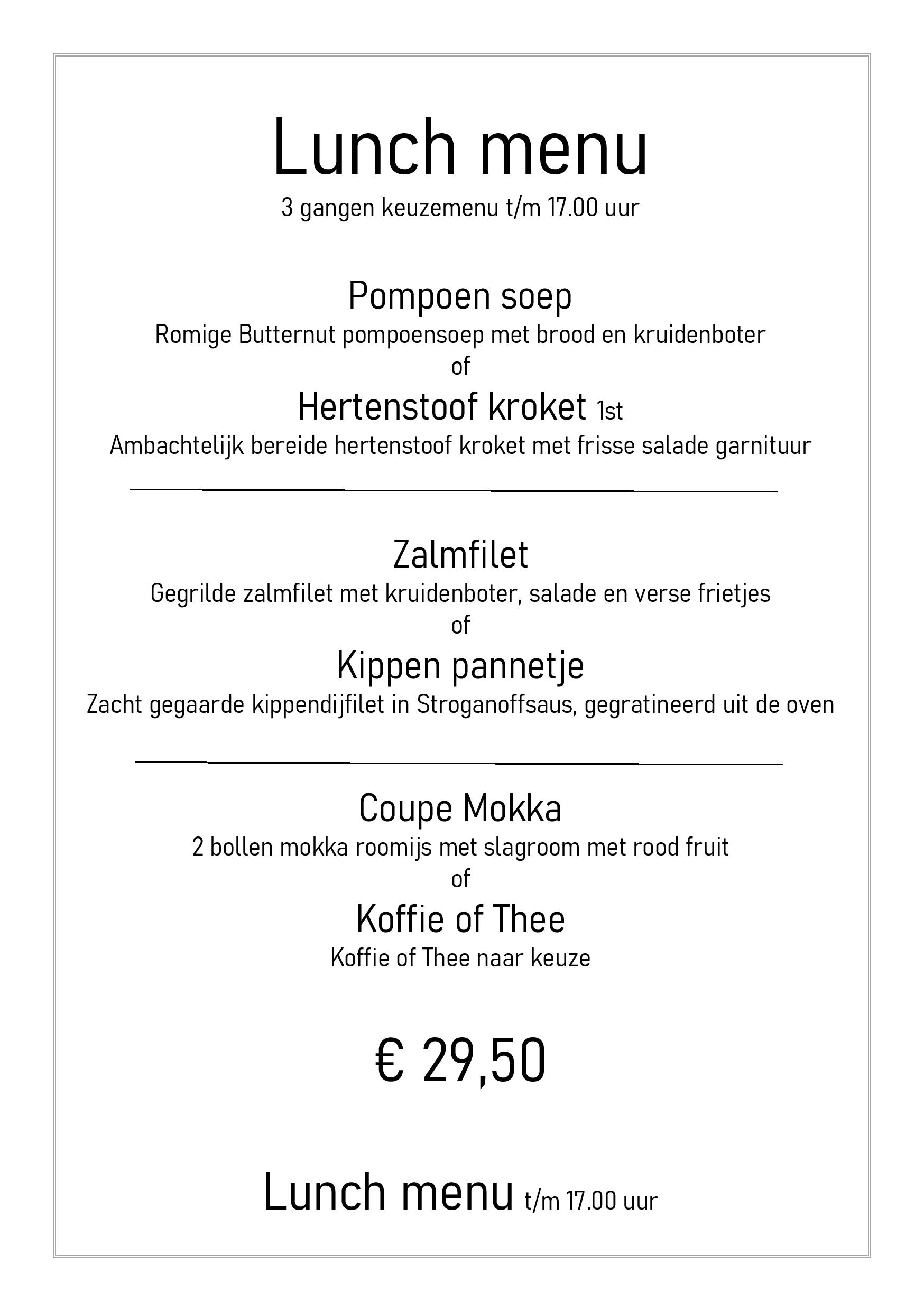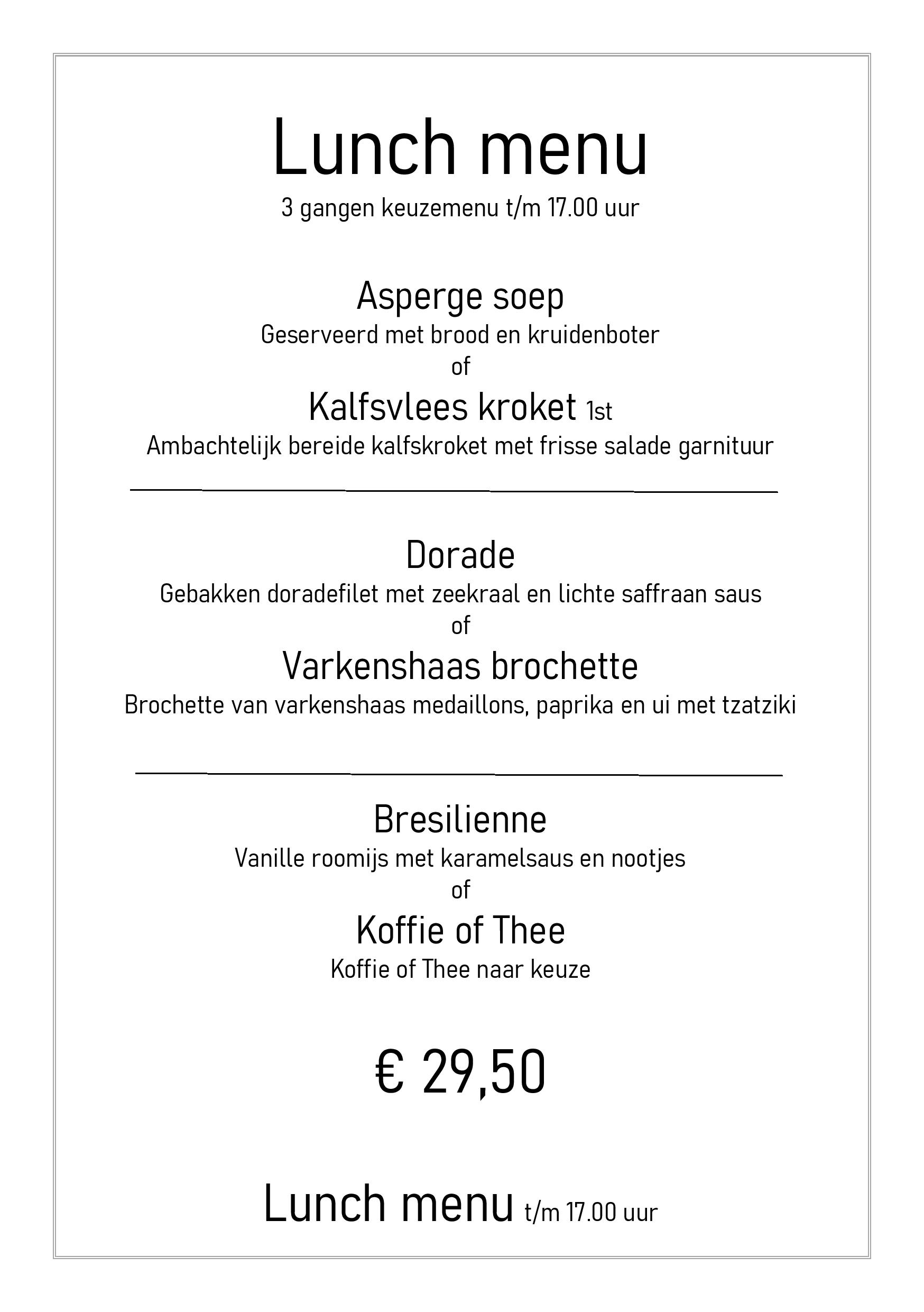 Onze filosofie is dat eten herkenbaar, goed, eerlijk en smakelijk moet zijn. Verse producten, van goede kwaliteit , bij voorkeur uit de streek rechtstreeks van de boerderij en telers. Prijs-kwaliteit en zeker gastvrijheid staan bij ons hoog in het vaandel dus wanneer u als gast tevreden bent; is onze dag goed!